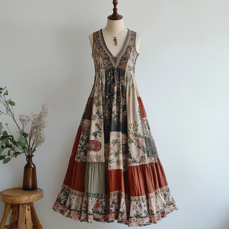 Retro Floral Patchwork V Neck Sleeveless Cozy Linen Dress