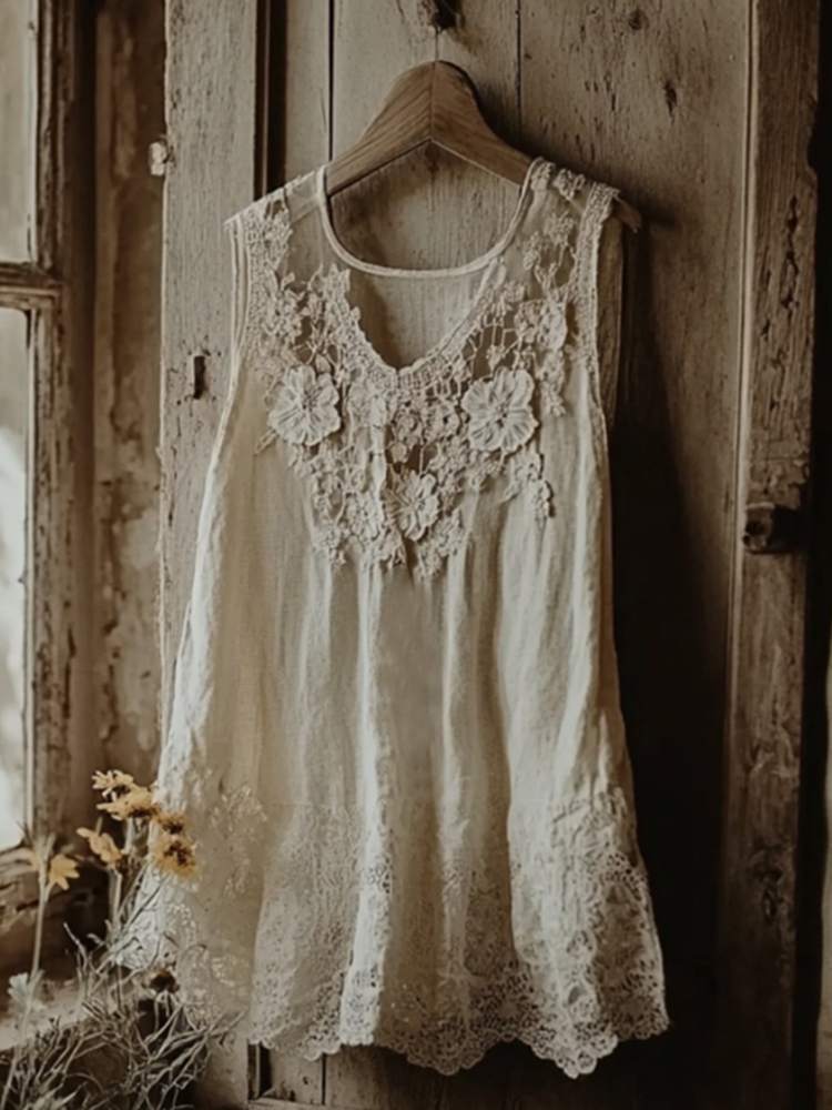 Vintage Lace Embroidery Art Linen Sleeveless Top