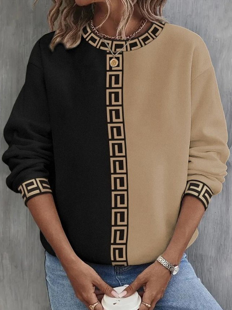 Greek Key Pattern Contrast Color Round Neck Casual Sweatshirt