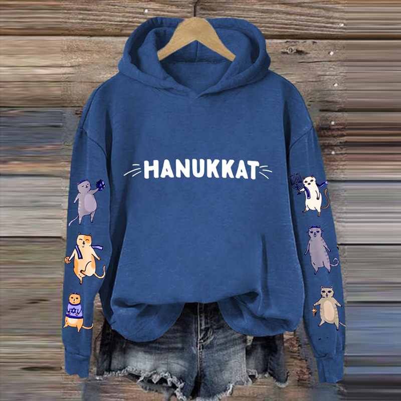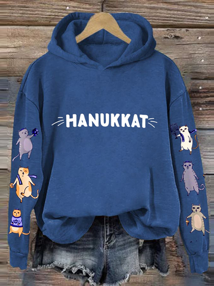 Women's Hanukkah Cat Print Casual Hoodie