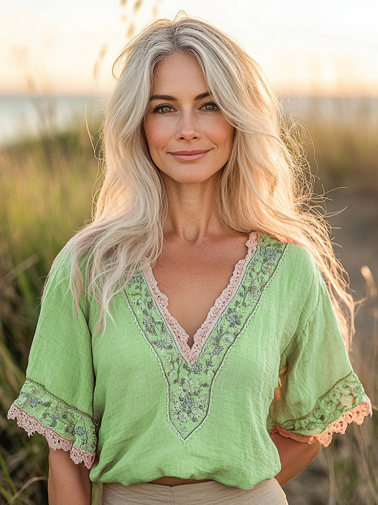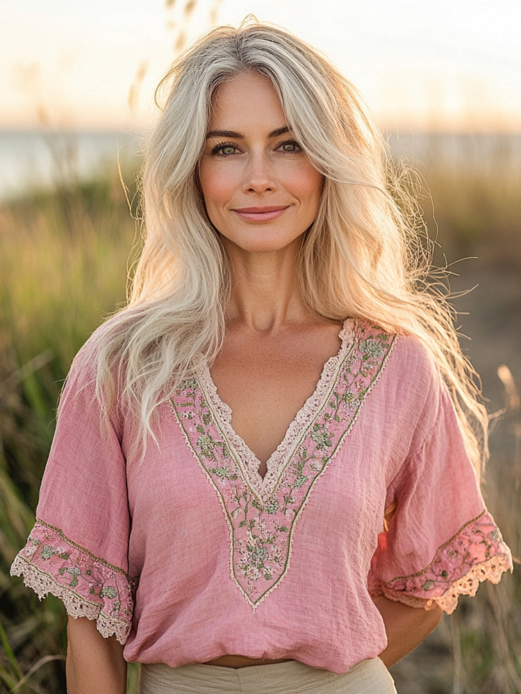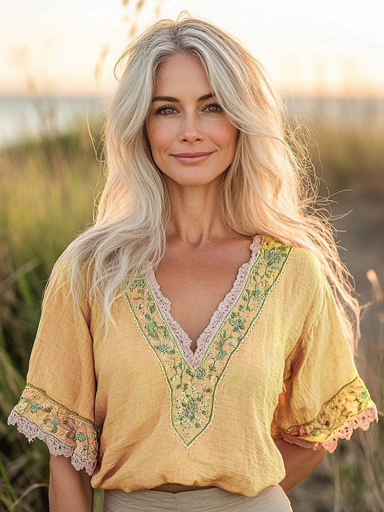 Women's Bohemian Retro Flowers Linen Blend  T-shirt