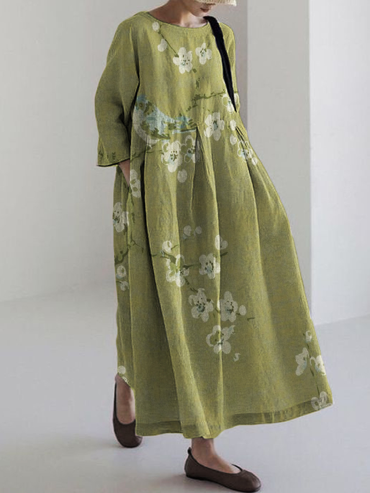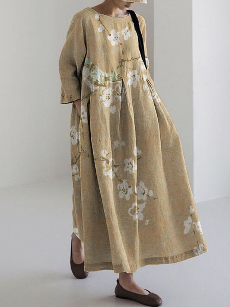 Bird on Plum Blossom Branches Japanese Linen Blend Maxi Dress