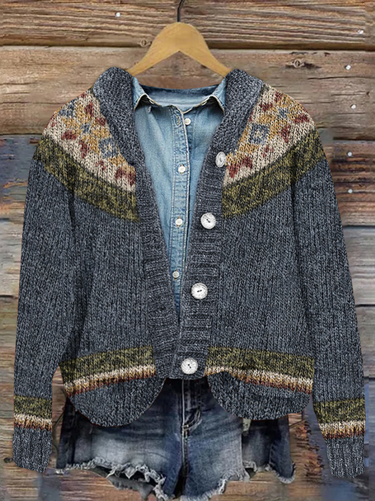 Button  Color Block Icelandic Pattern Printed Cardigan