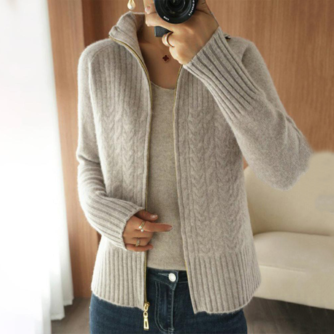 Cable-Knit Apricot Plain Zip V Neck Sweater Cardigan