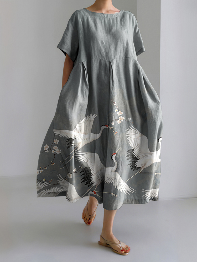 Crane Print Crew Neck Short Sleeves Midi Dress