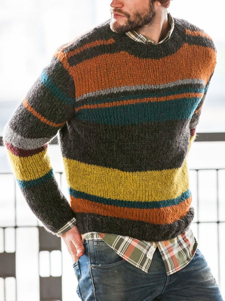 Dark Gray Striped Crew Neck Casual Men's Sweater