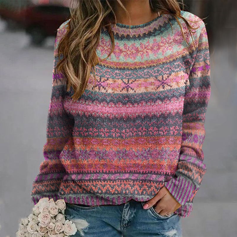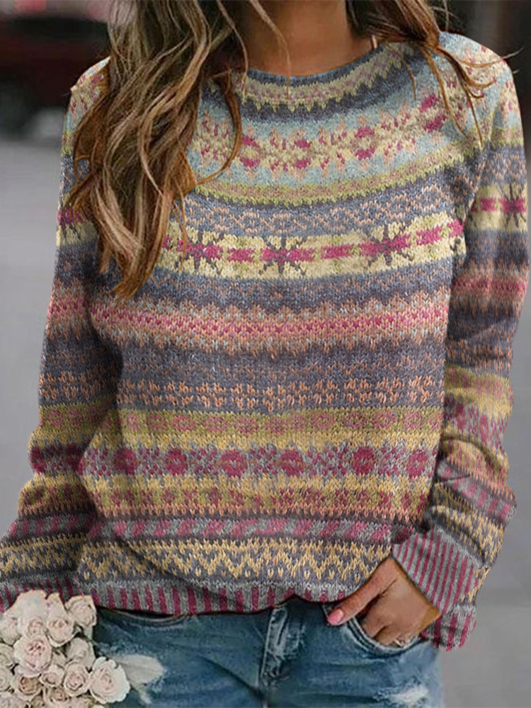 Ethnic Style Jacquard Vintage Crew Neck Sweater