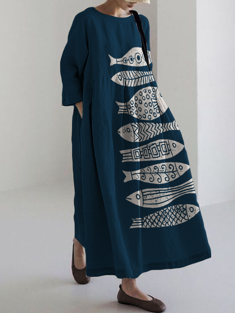 Fish Japanese Lino Art Flowy Linen Blend Maxi Dress