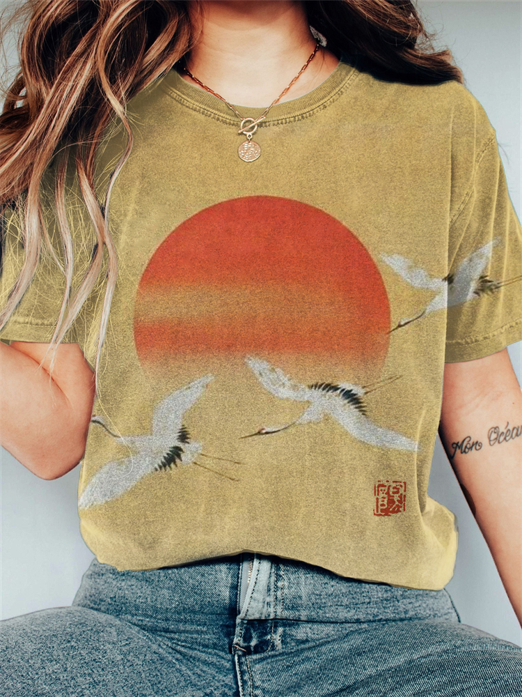 Flying Cranes Sunrise Japanese Art Vintage T Shirt