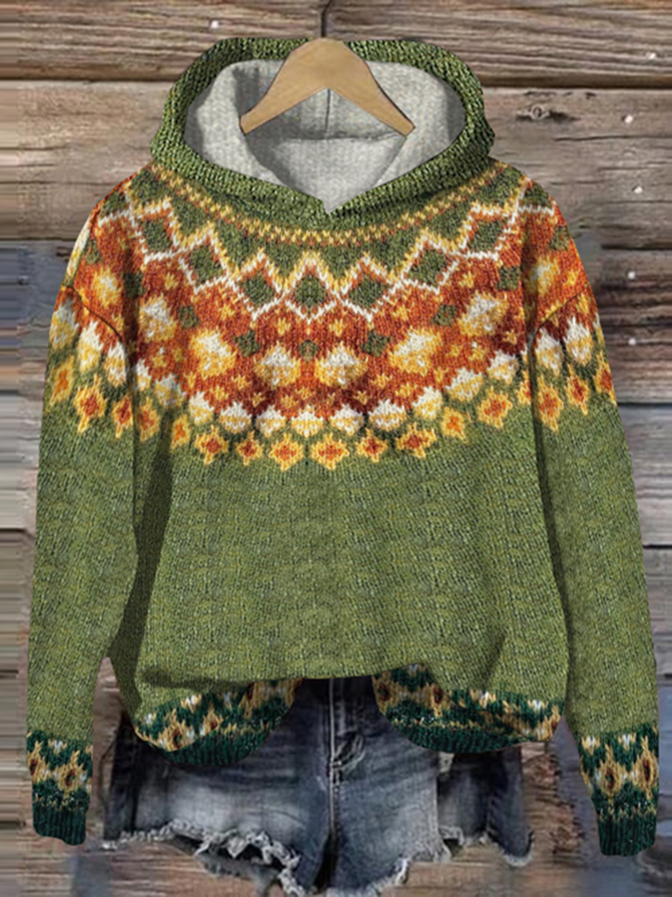 Iceland Geometric Diamond Contrast Jacquard Hooded Sweater