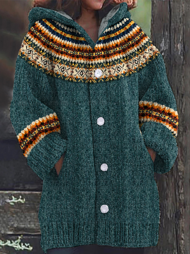 Icelandic Ethnic Print Long Sleeve Knitted Hooded Cardigan