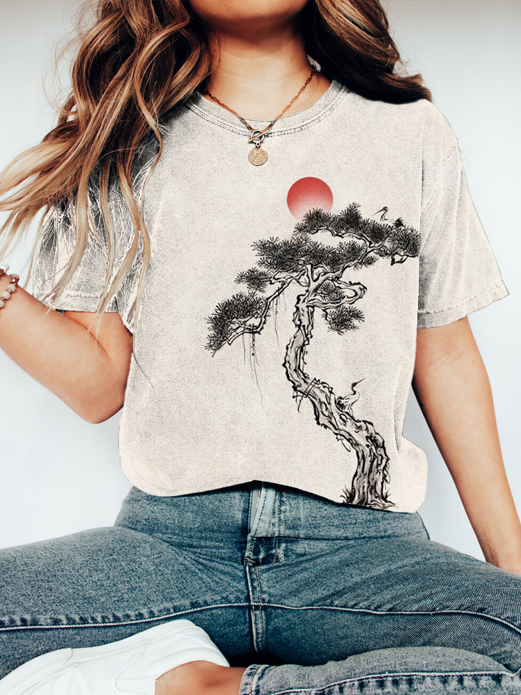 Ink and Pine Japanese Art Print Washed Cotton Short Sleeve T-Shirt