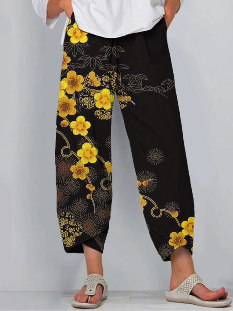 Japanese Art Flower Print Loose Casual Pants