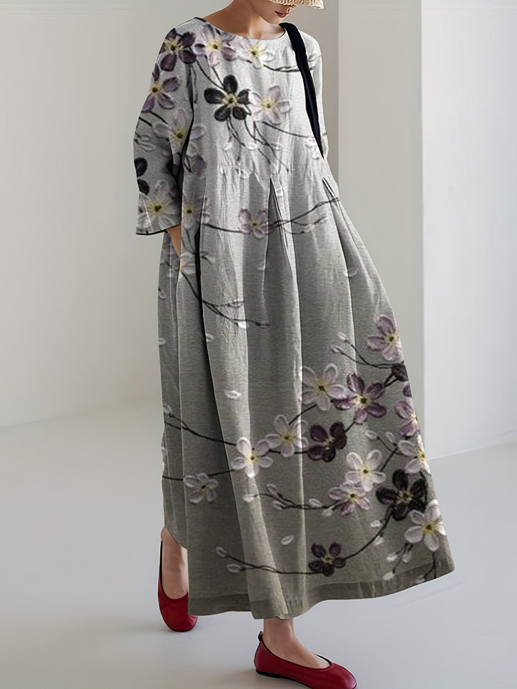 Japanese Art Flower Print Loose Midi Dress