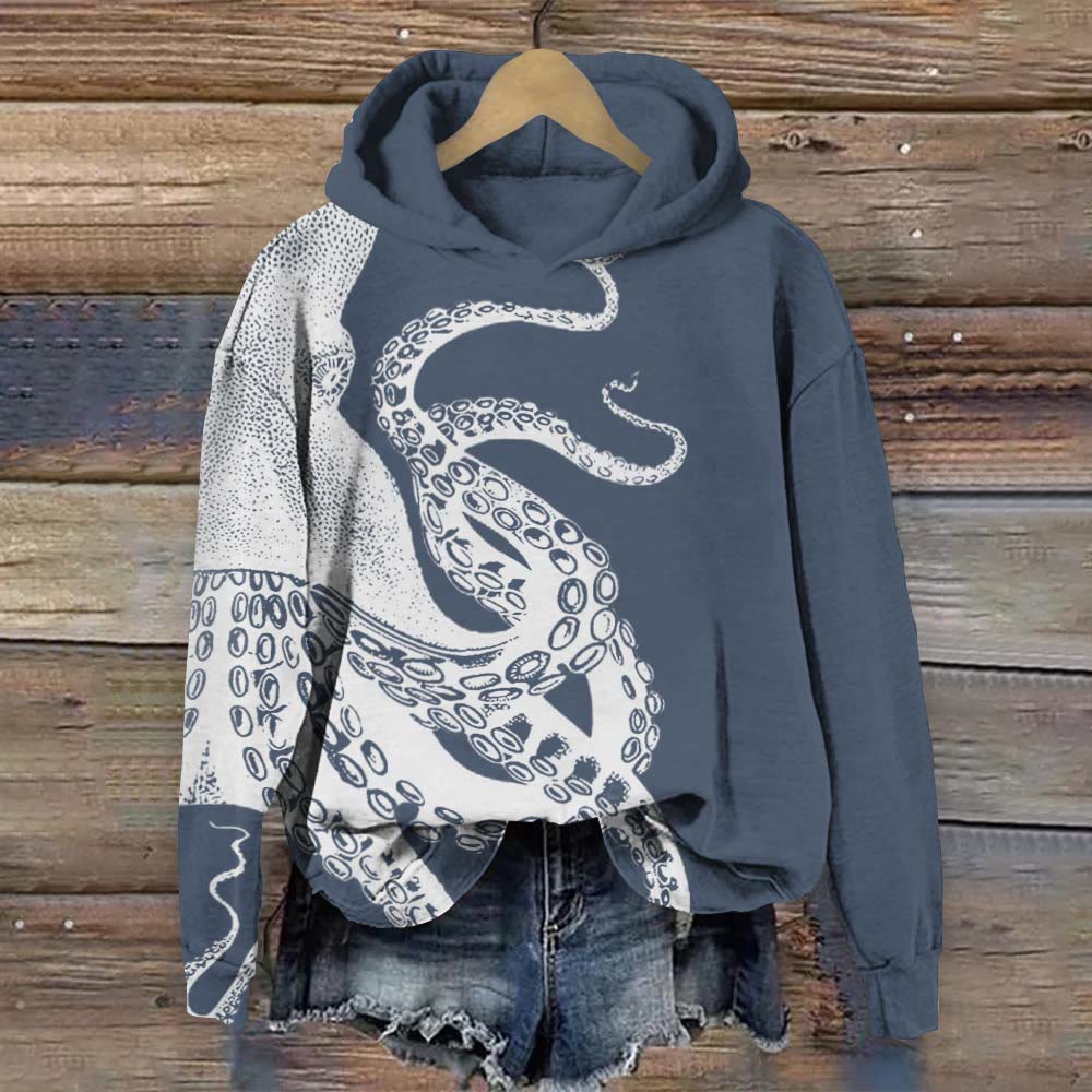 Japanese Art Octopus Print Long Sleeve Hoodie