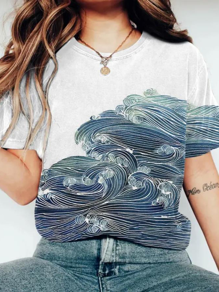 Japanese Style Ombre Wave Print Casual T-Shirt