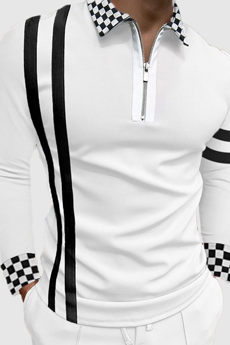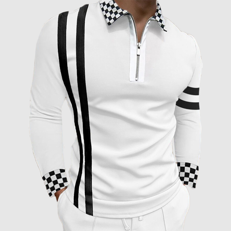 Men'S Long-Sleeved Lapel Striped Plaid Polo Shirt|