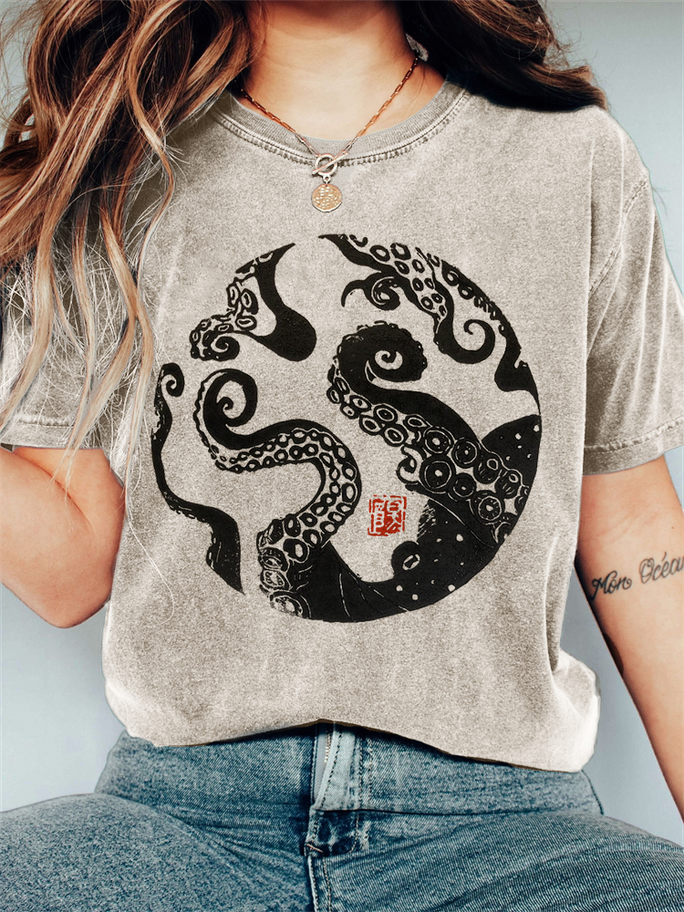 Octopus Japanese Lino Art Vintage Washed T Shirt