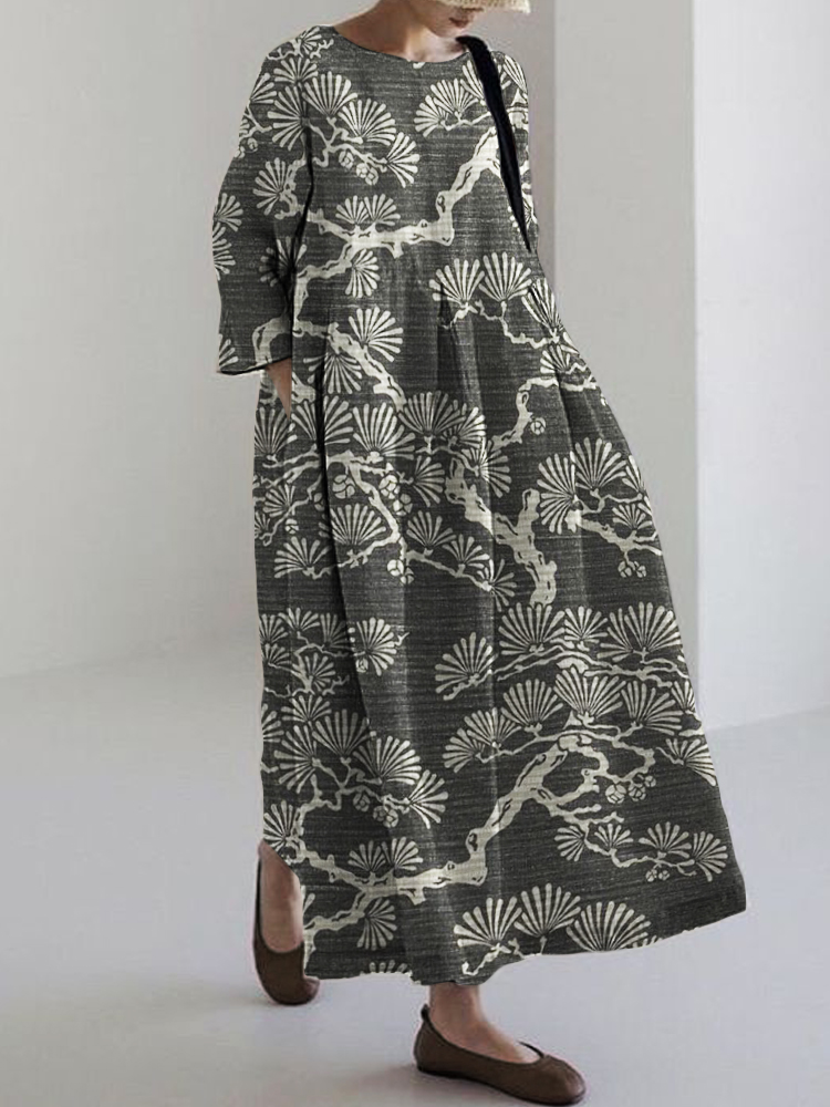 Pine Trees Japanese Lino Art Linen Blend Maxi Dress