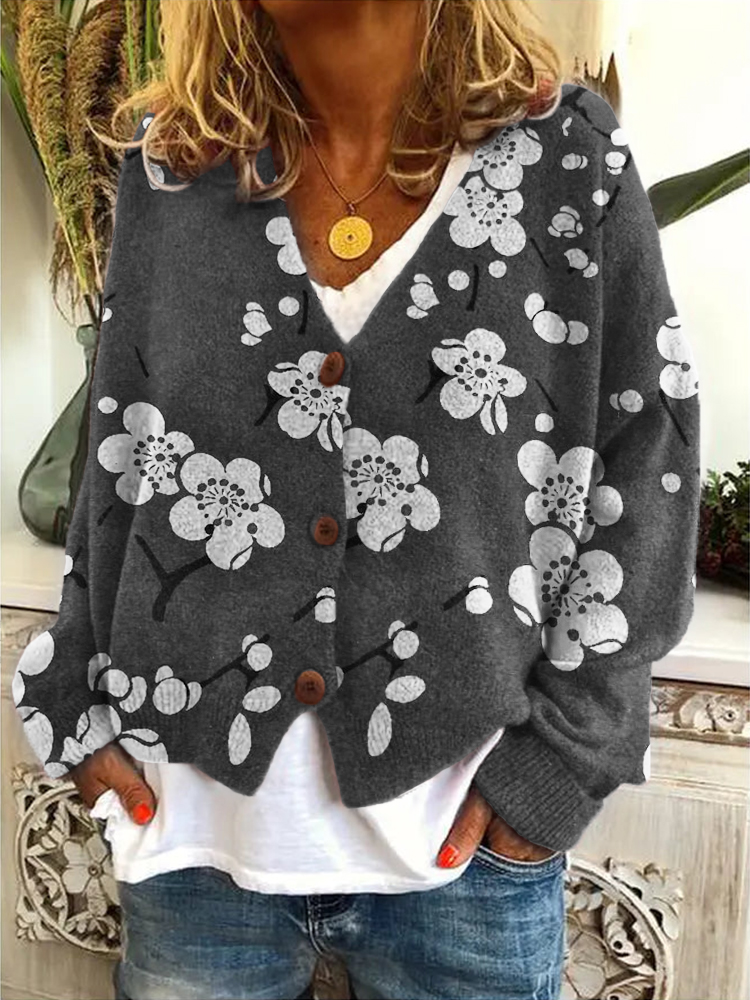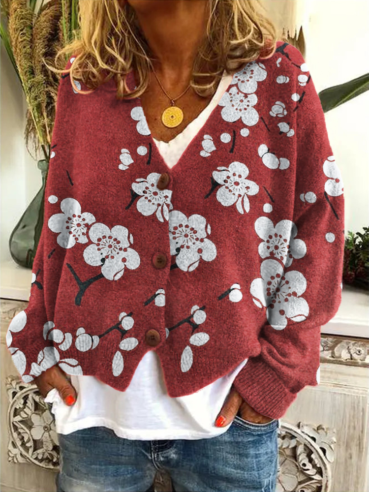 Plum Blossom Japanese Lino Art Cozy Knit Cardigan