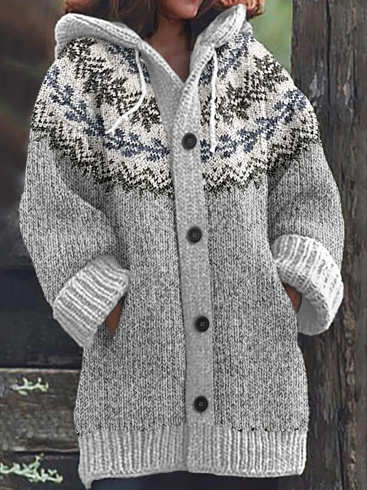 Retro Floral Lines Knitted Button Down Cozy Hoodie Sweater