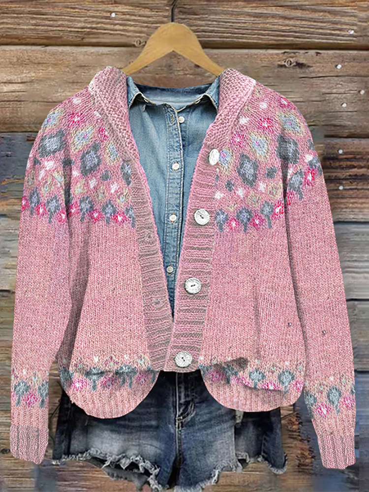 Retro Geometric Contrast Button Hooded Cardigan