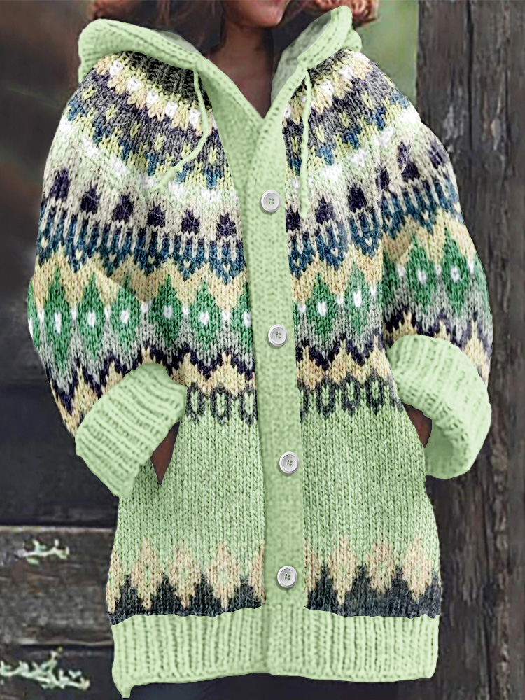 Retro Geometric Inspiration Icelandic Cozy Hooded Knitted Cardigan