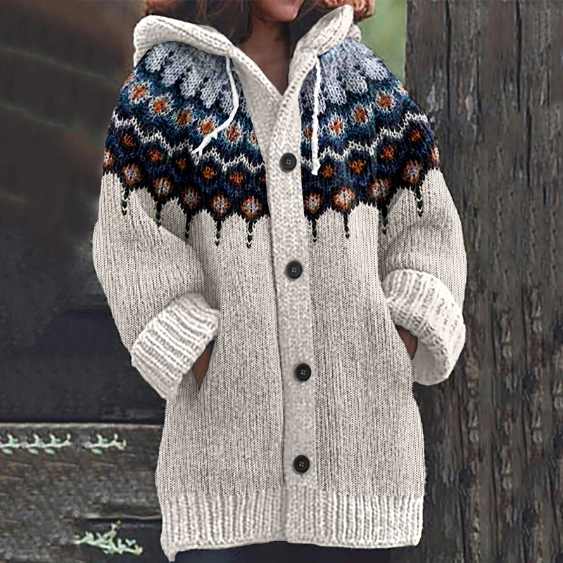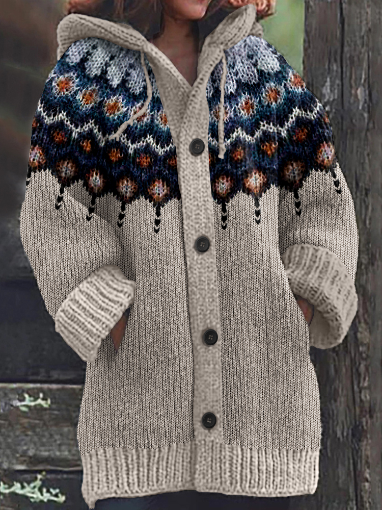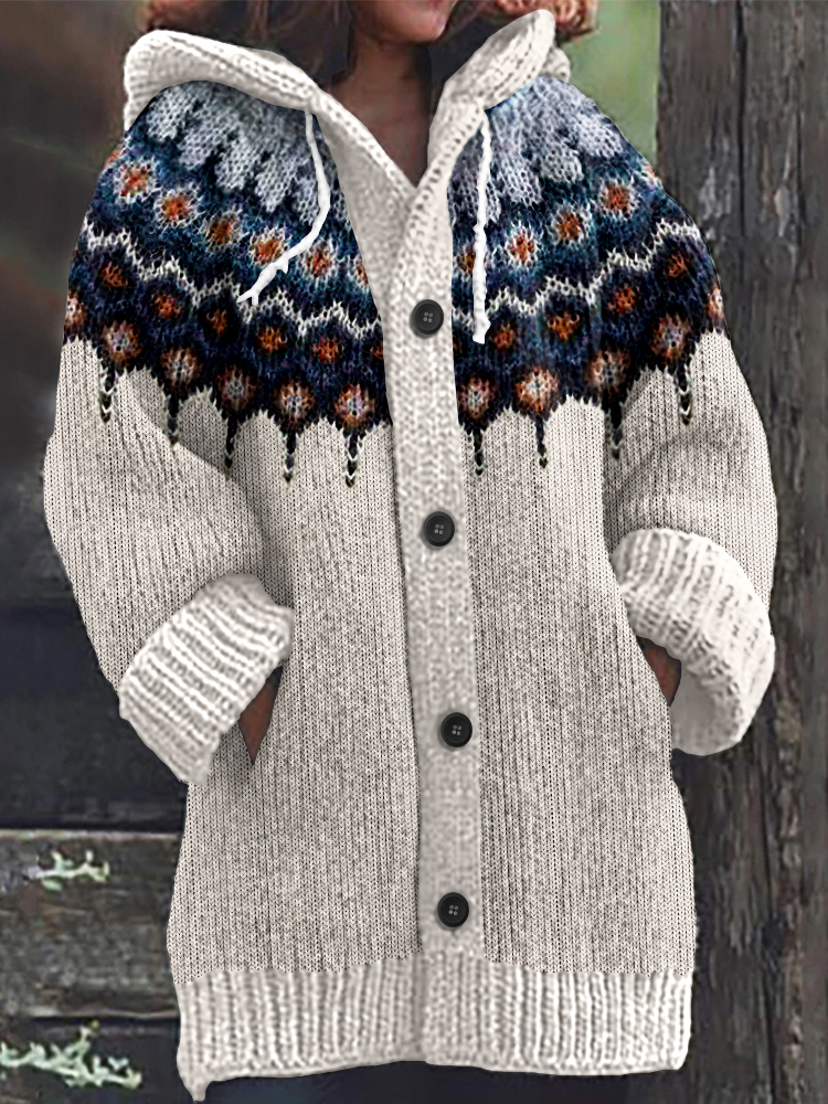 Retro Geometric Knitted Button Down Cozy Hoodie Sweater
