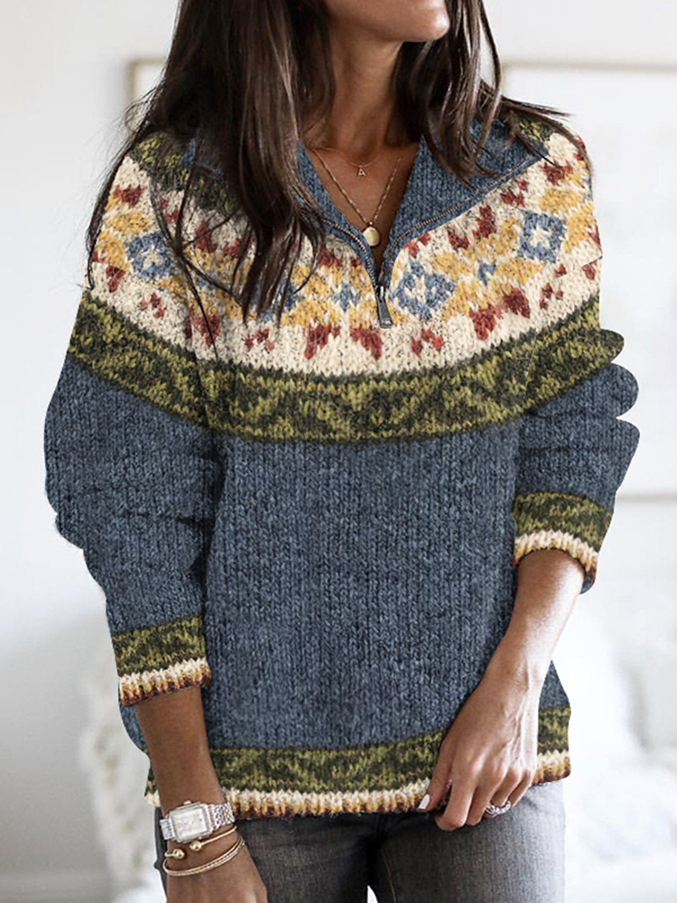Retro Geometric Knitted Button Down Ziper Cozy Sweater