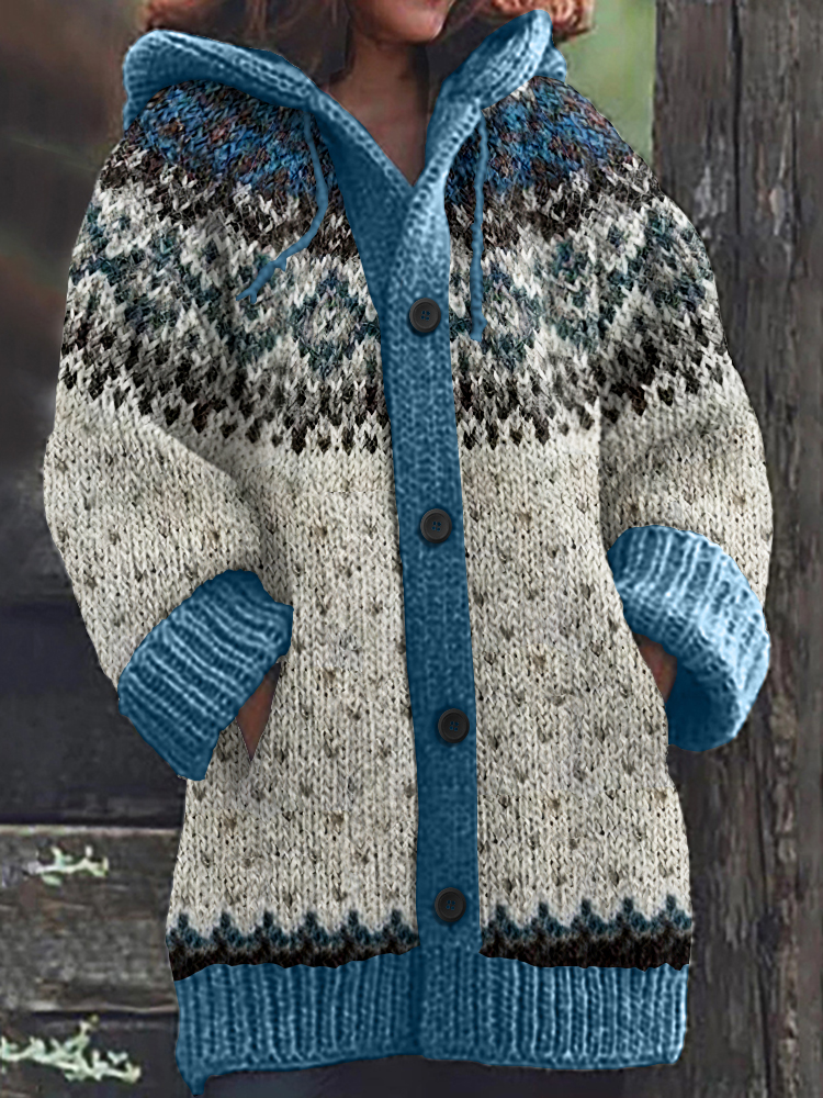 Retro Geometry Contrast Jacquard Button Cozy Sweater