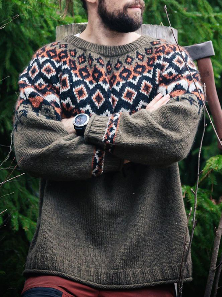 Retro Leopard Geometry Jacquard Icelandic Crew Neck Sweater
