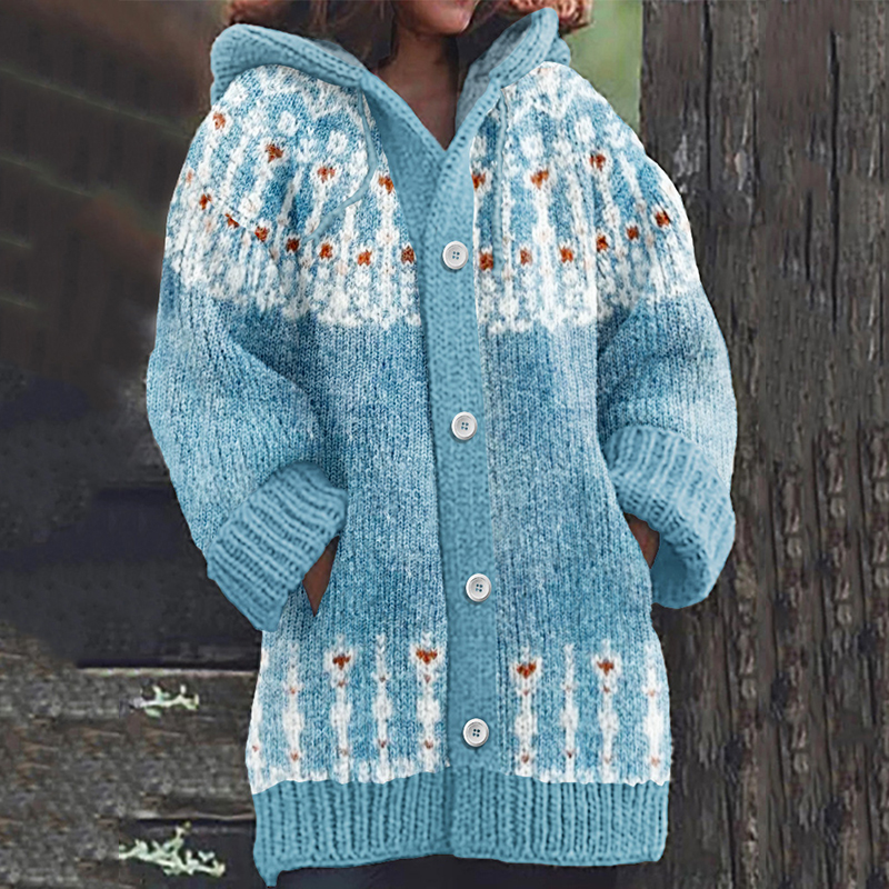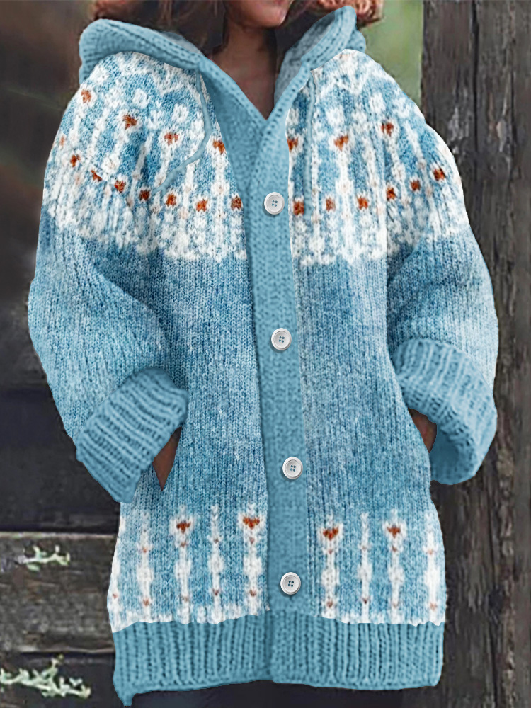 Retro Snowflake Inspiration Icelandic Cozy Hooded Knitted Cardigan