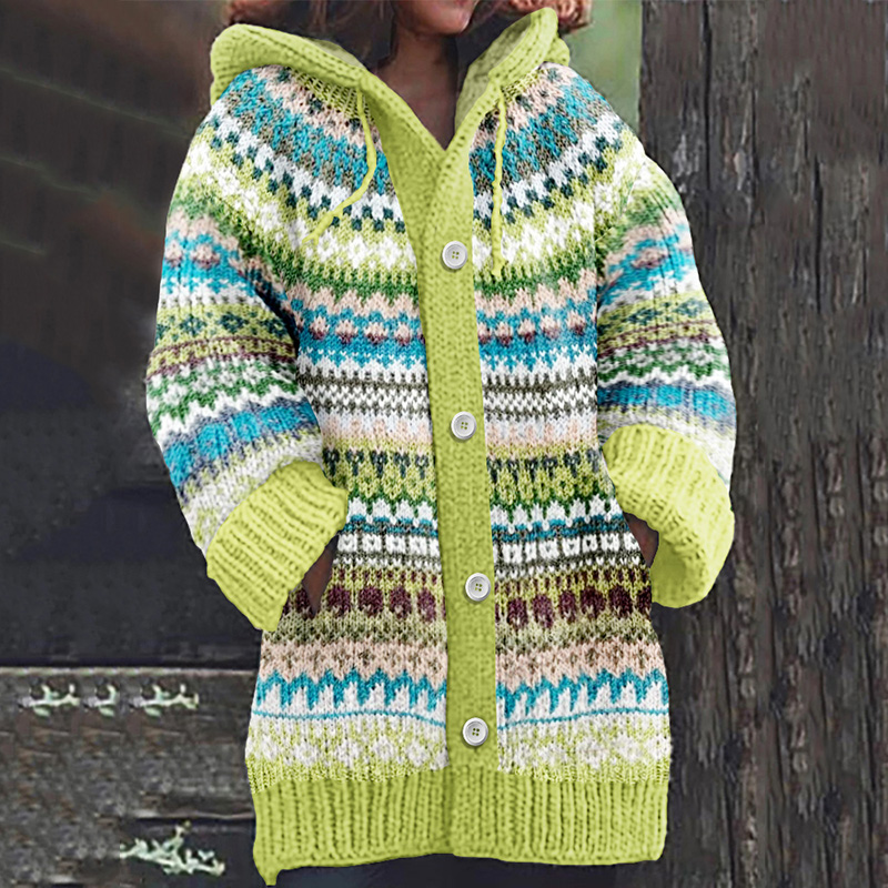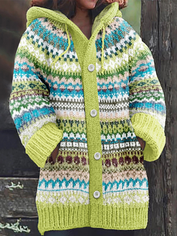 Retro Stripe Inspiration Icelandic Cozy Hooded Knitted Cardigan