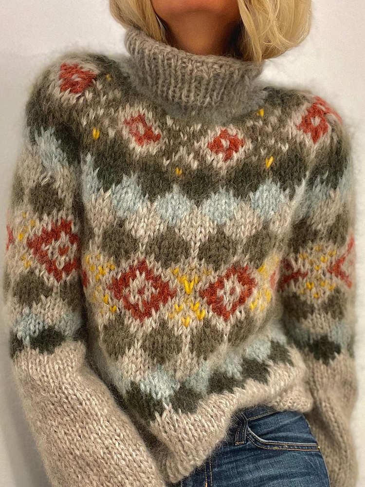 Retro Turtleneck Geometric Contrast Jacquard Sweater