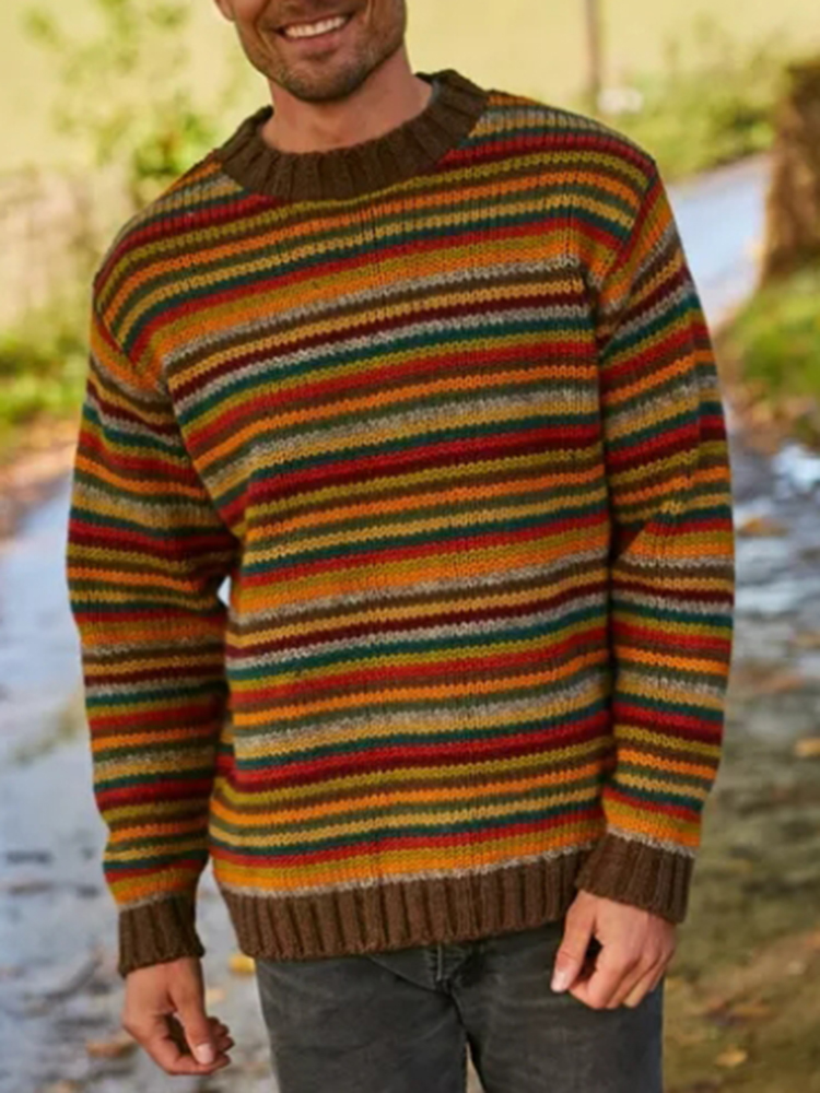 Retro Warm Colorful Striped Knitted Jacquard Iceland Crew Neck Sweater