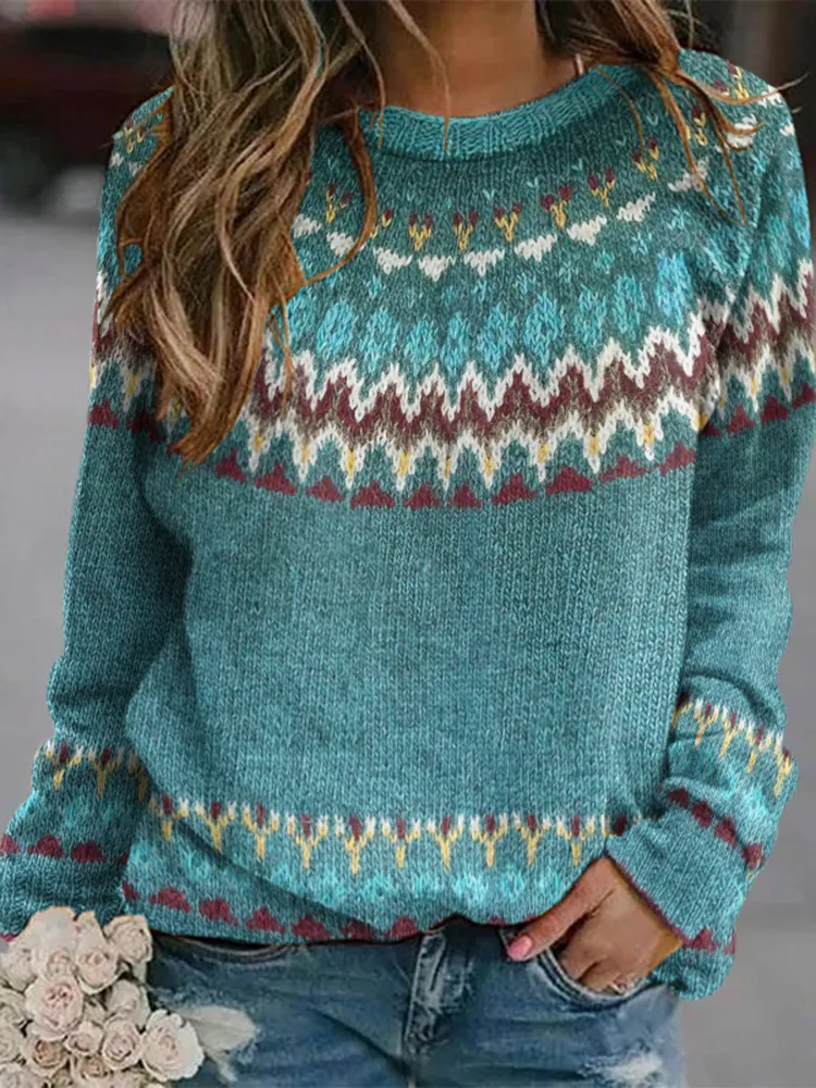 Retro Wave Pattern Contrast Jacquard Crew Neck Sweater