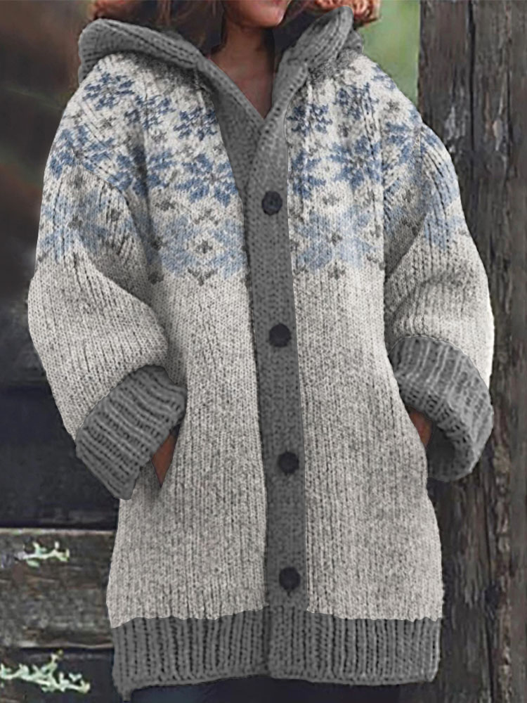 Rib Knit Double Lettlopi And Star Pattern Print Hooded Sweater Cardigan