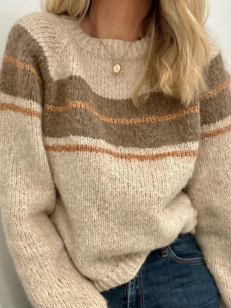 Simple Contrasting Color Striped Woven Crew Neck Sweater
