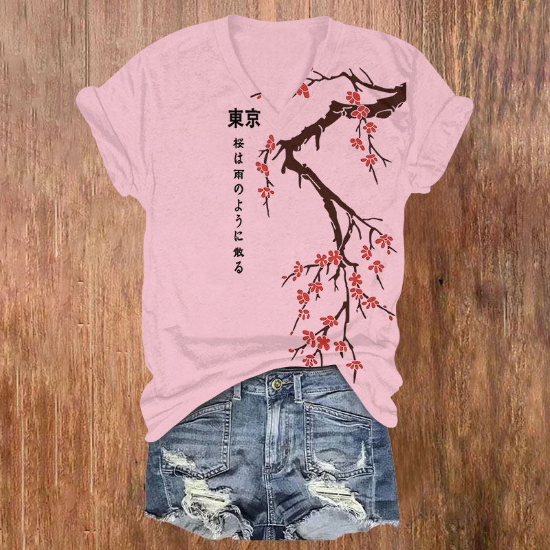 Tokyo Japanese Cherry Blossoms Print V-Neck T-Shirt