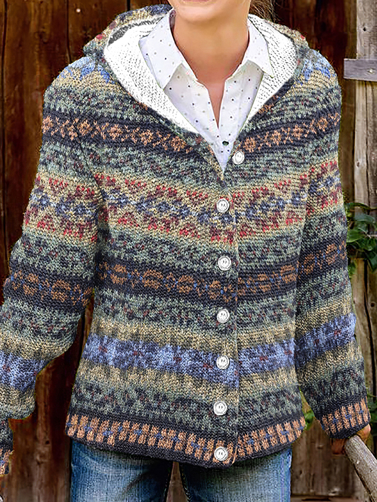 Vintage Ethnic Print Hooded Button Knit Cardigan