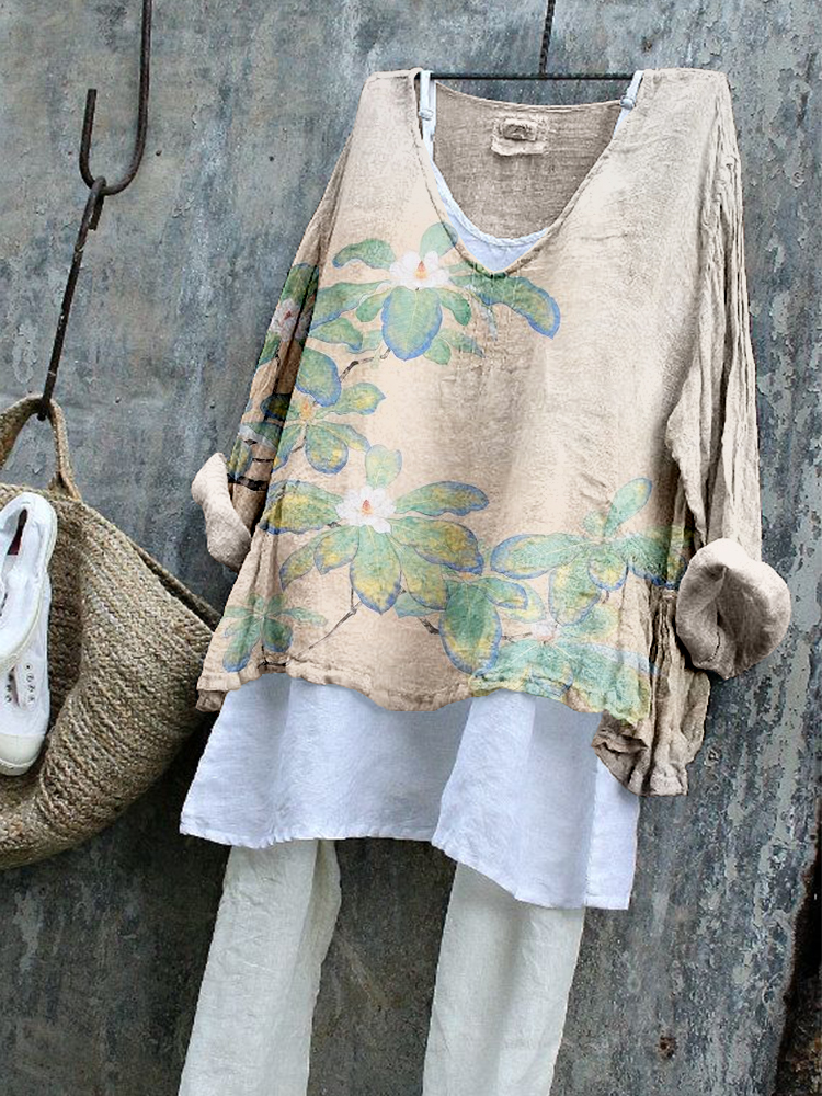 Vintage Flower Art Pattern Linen Blend Flowy Tunic