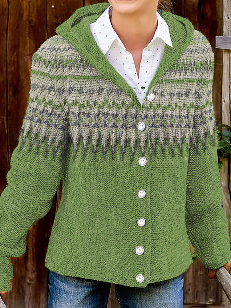 Vintage Geometric Print Knitted Button Hooded Cardigan
