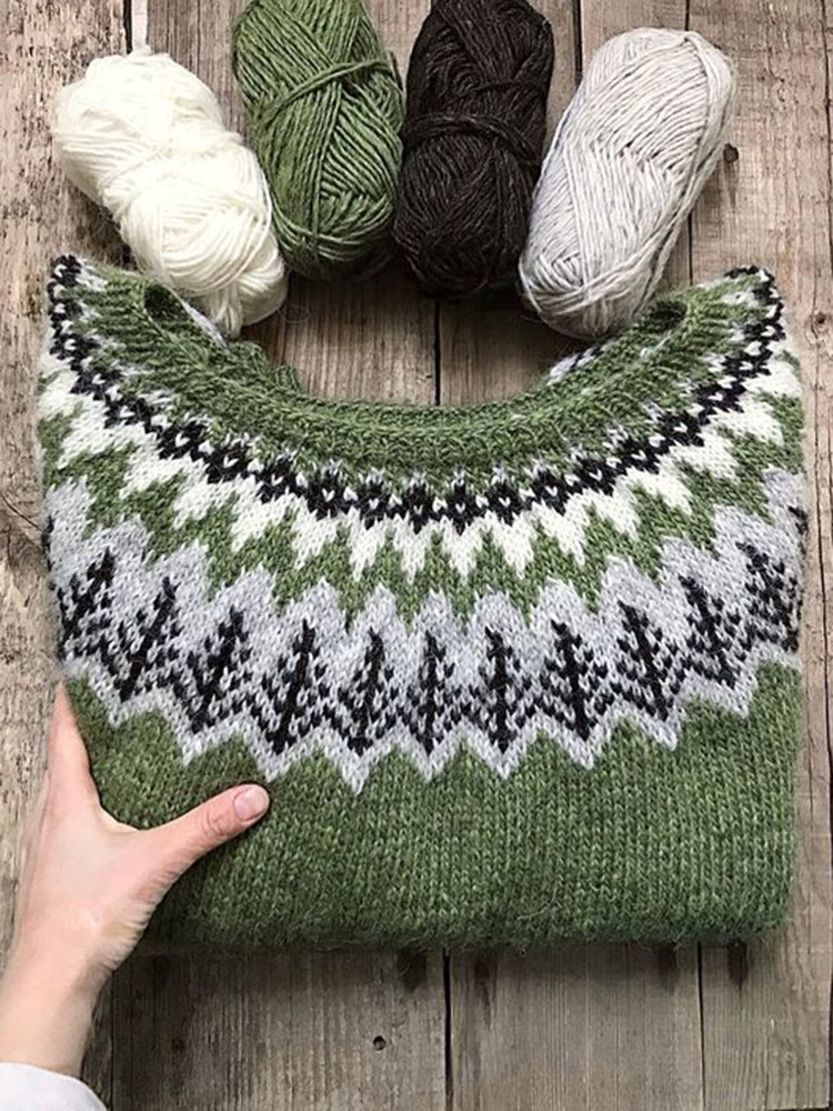 Vintage Geometry Icelandic Pattern Printed Round Neck Knit Sweater
