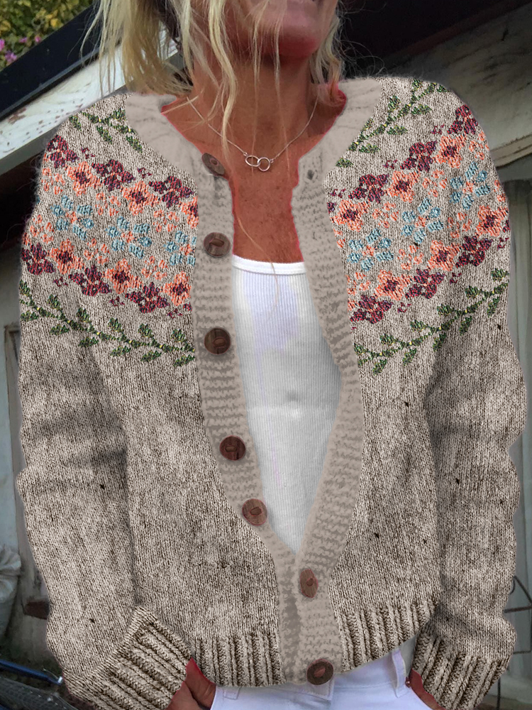 Vintage Icelandic Floral Art Print Cozy Button Sweater