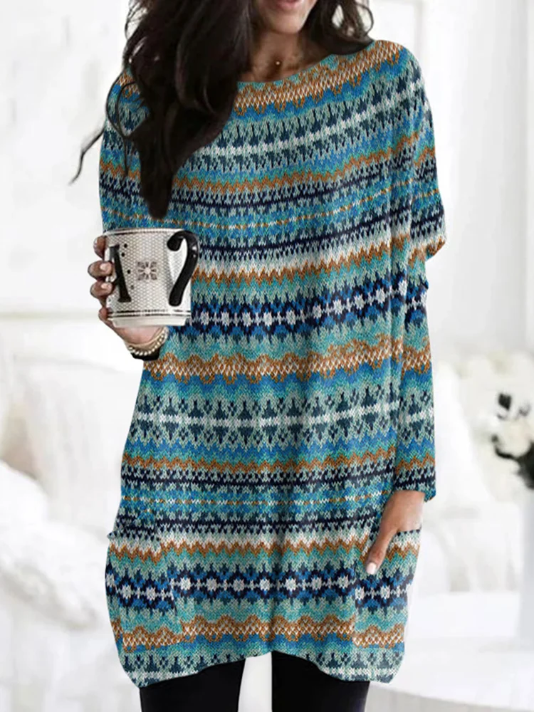 Vintage Icelandic Tribal Knitted Warm Round Neck Mid-Length Sweater Dress