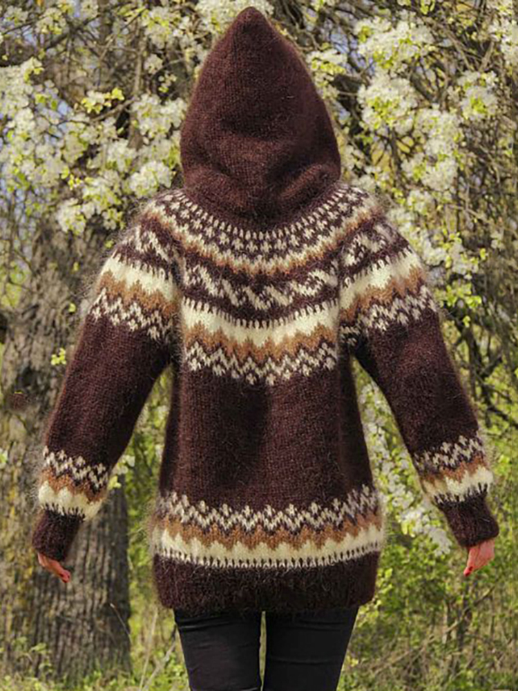 Vintage Icelandic Wave Geometric Knit Jacquard Hooded Sweater