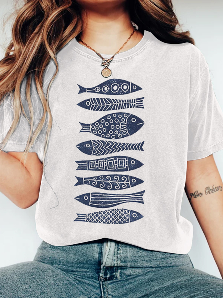 Vintage Japanese Art Fish Printed Round Neck T-Shirt