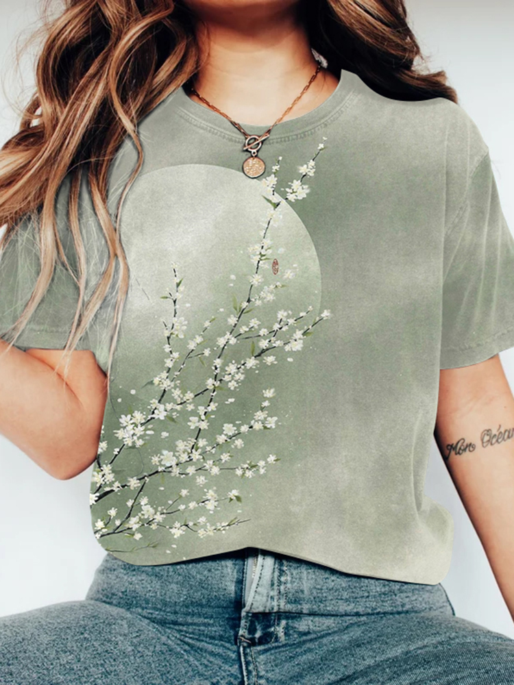 Vintage Japanese Art Floral Round Neck Casual T-Shirt