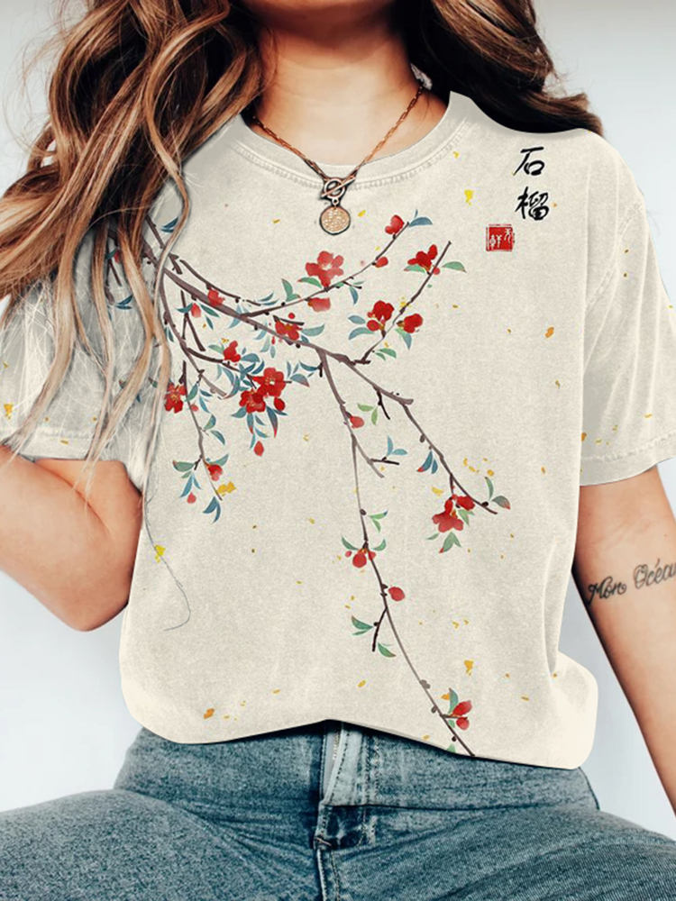Vintage Japanese Art Floral Round Neck T-Shirt