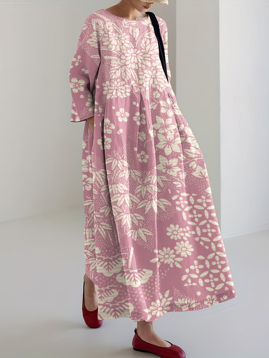Vintage Japanese Art Flower Print Casual Midi Dress